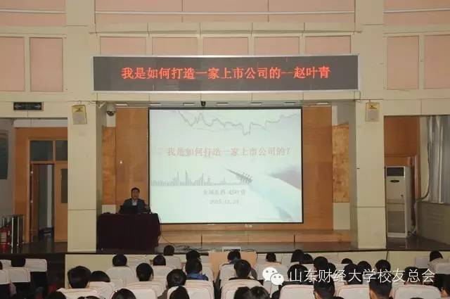 下午,由赵叶青主讲的《我是如何打造一家上市公司的》报告会在山东财经大学燕山校区三号教学楼报告厅举行,近200名校友、在校师生听取了报告,报告会由校友工作办公室、工商学院、会计学院主办,由校友工作办公室主任耿金波主持。