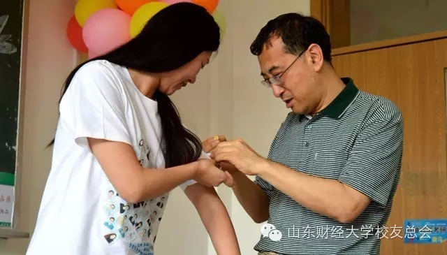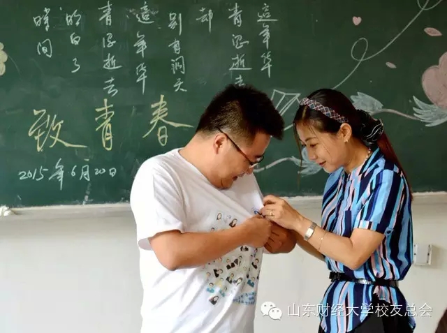 老师为同学们发校徽,新财大新气象,校徽虽小意义却十分重大,同学们郑重的把它别在特别制作的衣服上,纯白的山财大T恤上又加印了每位同学的照片,独一无二的衣服,独一无二的01金本二班。