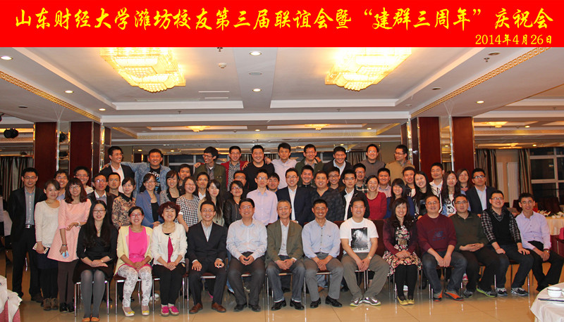 2014年4月26日,春风细雨,空气宜人。山财大潍坊校友第三届联谊会暨“建群三周年”庆祝会在潍坊君尚假日酒店如期举行。来自潍坊以及青州、安丘、高密等地区的、1985级至2010级60余名校友齐聚一堂,共叙情谊。青岛校友会常务秘书长陈明、北京校友代表曹富淇以及山东大学、山东大学威海分校、山东师范大学、西安美术学院的潍坊校友代表也参加了联谊会。学校校友办公室主任耿金波、原两校潍坊校友会会长张炳伟、王绪洲均致电问候,向校友们表达祝福。