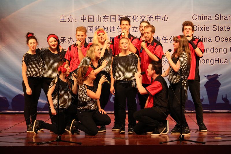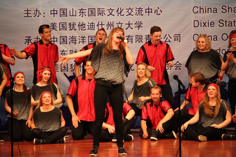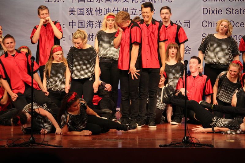 我校大学生艺术团首先登台开场。啦啦操、笛子独奏《策马扬鞭运粮忙》、独唱《鸿雁》、《又唱浏阳河》等表演让全场观众倾情鼓掌。之后,“红焰歌舞团”为现场观众带来激情洋溢、与众不同的演出,MASHUP乐队的劲歌瞬间点燃全场的气氛,爵士舞与劲舞的完美结合令人大饱眼福,多首经典音乐的串烧带领观众一起high翻全场,将演出推向高潮。管乐、舞蹈、鼓乐、合唱等充满想象力的精彩表演形式和风格,表现了演员高超的艺术水准,博得了在场观众的热烈掌声。也让现场观众欣赏到原汁原味的美国现代流行歌舞和乡村音乐,感受到不同的异域风情。中、美双方大学生合作精心演绎的《茉莉花》,将整场演出推向了高潮,该节目将中、美国大学生的合唱艺术、表演融为一体。