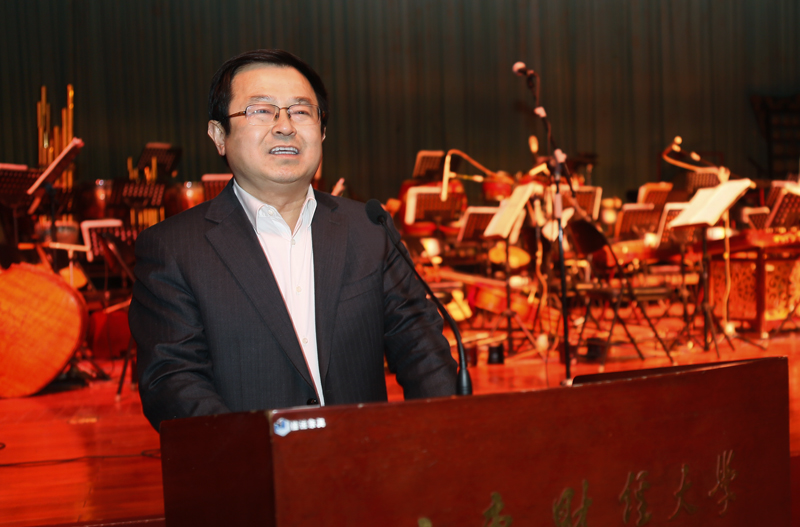 音乐会开始前,党委书记郝书辰代表校党委、行政向在座的各位以及全校广大师生员工、校友拜年。他说,按照中央关于厉行勤俭节约的新要求,学校把以往的新年茶话会、春节团拜会和校友联谊酒会合并为一次新春音乐会,既是迎新春的形式创新,也必将活跃校园文化生活,满足师生员工的文化需求。同时,他还对原省人大常委会副主任莫振奎(1963级外贸专业校友)等各位校友的到来表示热烈的欢迎,对广大校友对母校的支持和关心表示衷心的感谢。