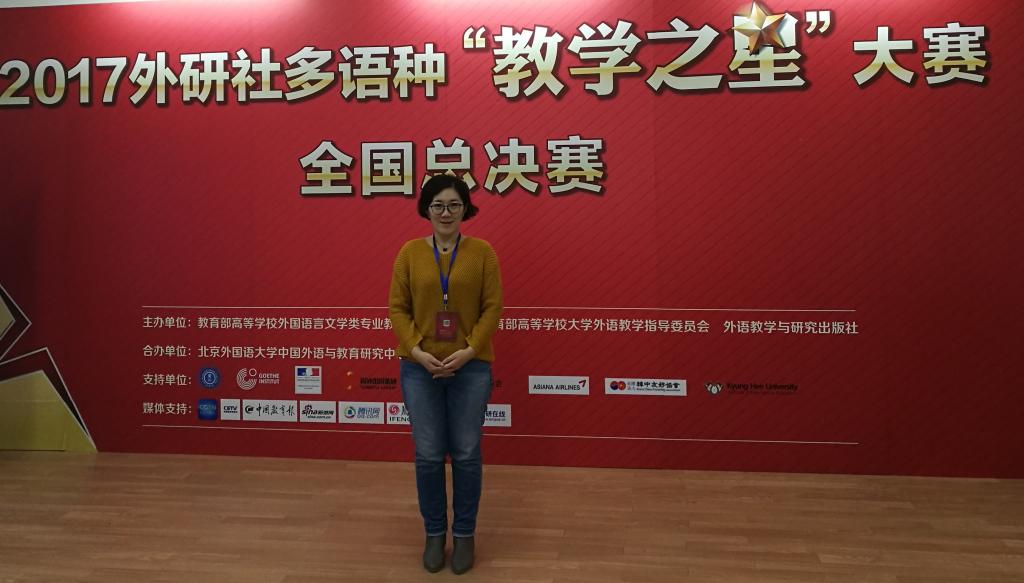 外研社“教学之星”大赛是国内高校外语教育界的一项大规模、高水平的权威赛事。为响应国家“一带一路”政策下培养多语种国际化人才的号召,本次多语种“教学之星”大赛涵盖了德语、俄语、日语、法语、西班牙语、阿拉伯语和韩语等七个语种。大赛分为初赛、复赛和全国总决赛三个阶段。经初赛选拔的选手由大赛组委会组织专家进行复赛远程筛选,从七个语种二百多名复赛选手中评选出91位晋级全国总决赛。全国总决赛采用现场比赛形式,包含教师现场说课、讲课、专家提问三个环节。王琳琳老师以其先进的教学理念、严谨的教学设计和扎实的语言基本功征服了全体评委专家,获得一致好评。