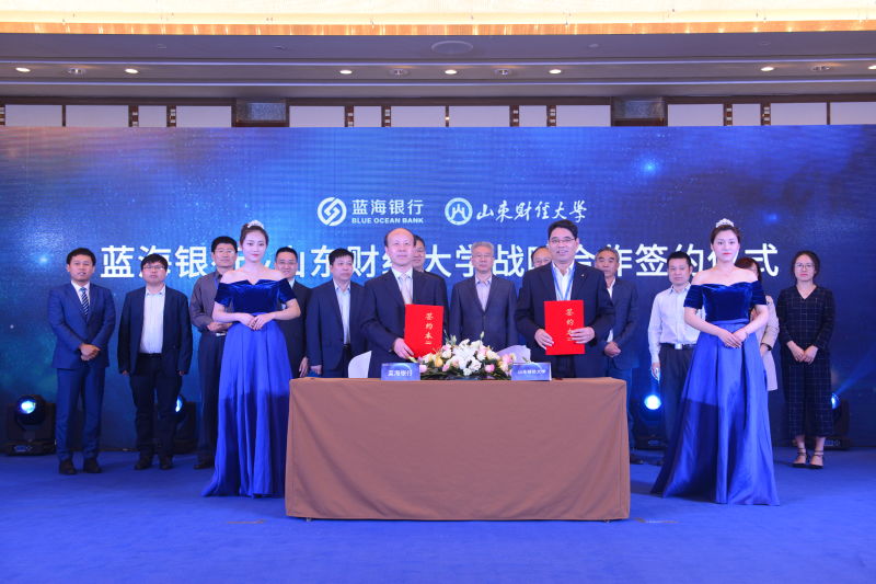 4月20日,我校与蓝海银行协同发展签约仪式在香格里拉大酒店举行。蓝海银行董事长陈彦、行长王有强、监事长宋修广及相关部门负责人,副校长张新及管理科学与工程学院、合作发展处和山东金融发展研究院负责人出席了签约仪式和相关活动。