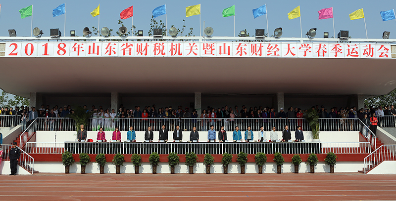4月27日上午8:30,2018年山东省财税机关暨山东财经大学春季运动会在舜耕校区田径场隆重开幕。省财政厅领导陈祥志,省地税局领导韩奎祥,财政部驻山东省财政监察专员办事处领导安钢,省财金投资集团公司领导鲁维、孙清华、殷明、李秀芹、王洁明,省农业发展信贷担保有限责任公司领导宋文旭、肖培强、胡成立、魏光明,学校党委书记王邵军、党委副书记车滨、副校长綦好东等出席开幕式。开幕式由副校长张新主持。