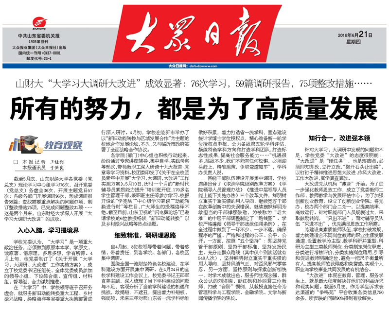 截至5月底,山东财经大学各党委(党总支)理论学习中心组学习76次,召开党委(党总支)务虚会36次,开展主题党日57次;各级各部门开展调研96次,形成调研报告59篇;查找需要重点解决的问题67项,制订整改措施75项,已完成问题整改31项……这是两个月来,山东财经大学深入开展“大学习大调研大改进”的成效。